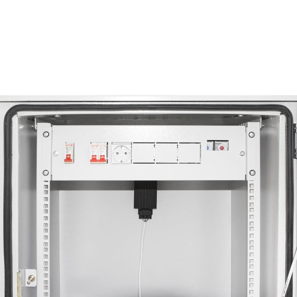 12HE Klimatisierte Rack-Schrank im Freien Aufputz-Klimaschrank für die Außenaufstellung. Die maximale statische Belastung des Schrankes beträgt 100 kg. Zur Grundausstattung gehören eine elektrische Verteilertafel mit Thermostaten, ein gemeinsamer Schalter, eine zusätzliche Steckdose, ein Türöffnungssensor und automatische Ein-/Ausschalter. Die Kabeleinführung erfolgt an der Unterseite des Gehäuses und die Leitungen sind hermetisch abgedichtet. Die erforderliche Temperatur im Inneren des Gehäuses wird durch einen Ventilatorblock geregelt. Die Gehäusewände sind zusätzlich mit Mineralwolle isoliert. Suvald-Schloss zum Schutz vor Diebstahl.