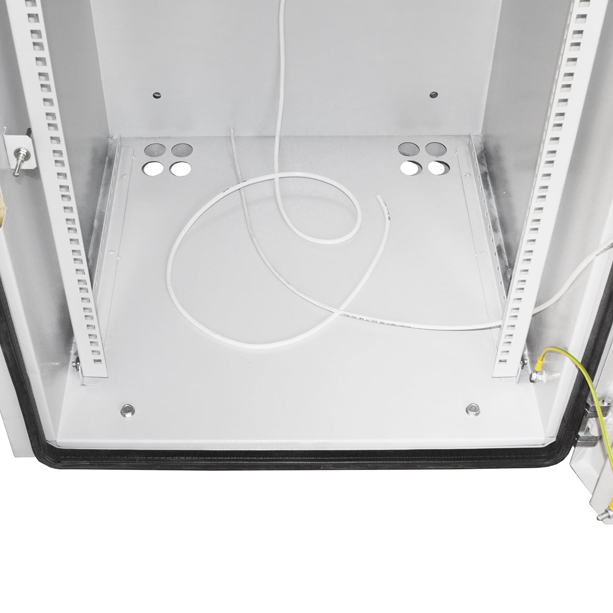 12HE Klimatisierte Rack-Schrank im Freien Aufputz-Klimaschrank für die Außenaufstellung. Die maximale statische Belastung des Schrankes beträgt 100 kg. Zur Grundausstattung gehören eine elektrische Verteilertafel mit Thermostaten, ein gemeinsamer Schalter, eine zusätzliche Steckdose, ein Türöffnungssensor und automatische Ein-/Ausschalter. Die Kabeleinführung erfolgt an der Unterseite des Gehäuses und die Leitungen sind hermetisch abgedichtet. Die erforderliche Temperatur im Inneren des Gehäuses wird durch einen Ventilatorblock geregelt. Die Gehäusewände sind zusätzlich mit Mineralwolle isoliert. Suvald-Schloss zum Schutz vor Diebstahl.