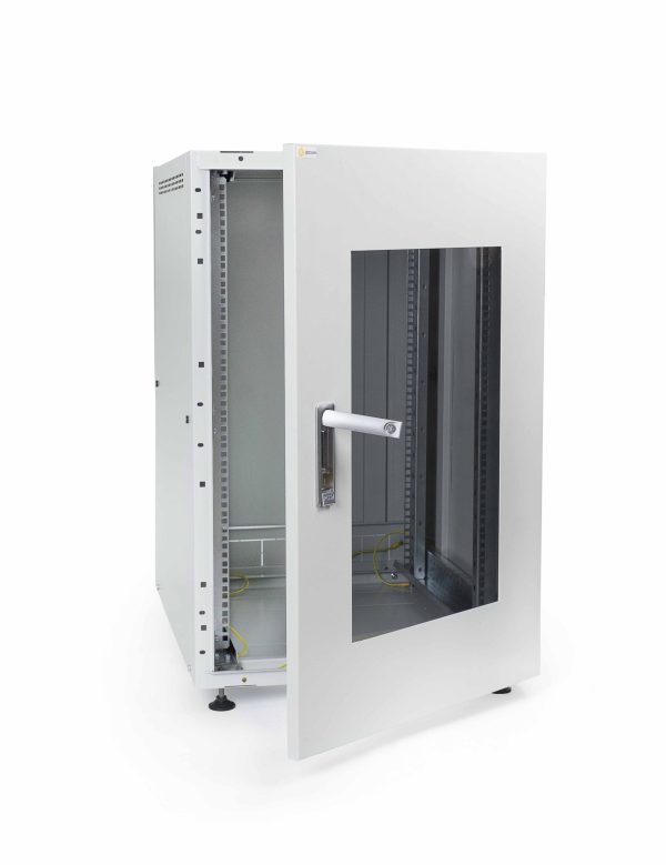 - Das Modell S-18HE-06-06-DS-PG-1 GREY bietet einzigartige Abmessungen mit einer Breite von 600 mm, einer Tiefe von 600 mm und einer 25-mm-Stufe zur präzisen Einstellung des Abstands des Montageracks.