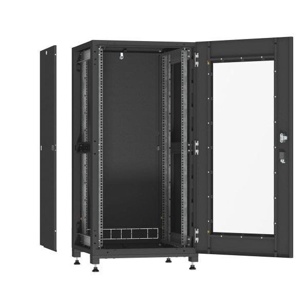- Das Modell S-24HE-08–08-DS-PG-1 Schwarz bietet einzigartige Abmessungen mit einer Breite von 800 mm, einer Tiefe von 800 mm und einer 25-mm-Stufe zur präzisen Einstellung des Abstands des Montageracks.